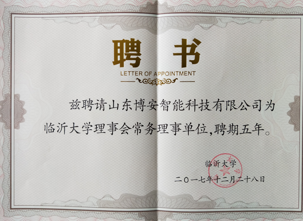 大會(huì)表決通過(guò)了《臨沂大學(xué)理事會(huì)章程》、《臨沂大學(xué)理事會(huì)組織機(jī)構(gòu)選舉辦法》,選舉了臨沂大學(xué)理事會(huì)組織機(jī)構(gòu)。博安智能榮譽(yù)當(dāng)選臨沂大學(xué)首屆理事會(huì)常務(wù)理事單位。