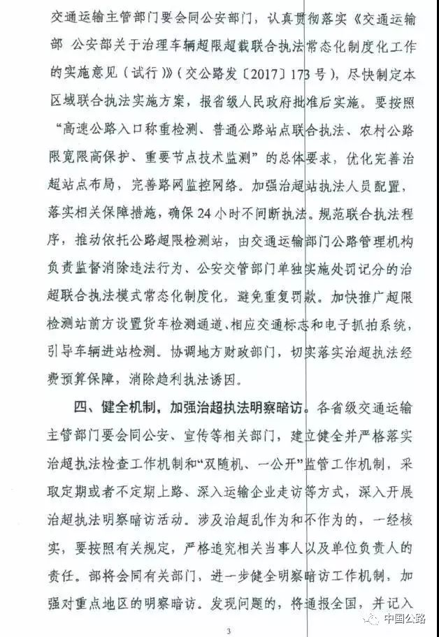 三、堅(jiān)定不移,全面推行聯(lián)合執(zhí)法常態(tài)化制度化。各省級(jí)交通運(yùn)輸主管部門要會(huì)同公安部門,認(rèn)真貫徹落實(shí)《交通運(yùn)輸部公安部關(guān)于治理車輛超限超載聯(lián)合執(zhí)法常態(tài)化制度化工作的實(shí)施意見(jiàn)(試行)》(交公路發(fā)〔2017〕173號(hào)),盡快制定本區(qū)域聯(lián)合執(zhí)法實(shí)施方案,報(bào)省級(jí)人民政府批準(zhǔn)后實(shí)施。要按照“高速公路入口稱重檢測(cè)、普通公路站點(diǎn)聯(lián)合執(zhí)法、農(nóng)村公路限寬限高保護(hù)、重要節(jié)點(diǎn)技術(shù)監(jiān)測(cè)”的總體要求,優(yōu)化完善治超站點(diǎn)布局,完善路網(wǎng)監(jiān)控網(wǎng)絡(luò)。加強(qiáng)治超站執(zhí)法人員配置,落實(shí)相關(guān)保障措施,確保24小時(shí)不間斷執(zhí)法。規(guī)范聯(lián)合執(zhí)法程序,推動(dòng)依托公路超限檢測(cè)站,由交通運(yùn)輸部門公路管理機(jī)構(gòu)負(fù)責(zé)監(jiān)督消除違法行為、公安交管部門單獨(dú)實(shí)施處罰記分的治超聯(lián)合執(zhí)法模式常態(tài)化制度化,避免重復(fù)罰款。加快推廣超限檢測(cè)站前方設(shè)置貨車檢測(cè)通道、相應(yīng)交通標(biāo)志和電子抓拍系統(tǒng),引導(dǎo)車輛進(jìn)站檢測(cè)。協(xié)調(diào)地方財(cái)政部門,切實(shí)落實(shí)治超執(zhí)法經(jīng)費(fèi)預(yù)算保障,消除趨利執(zhí)法誘因。