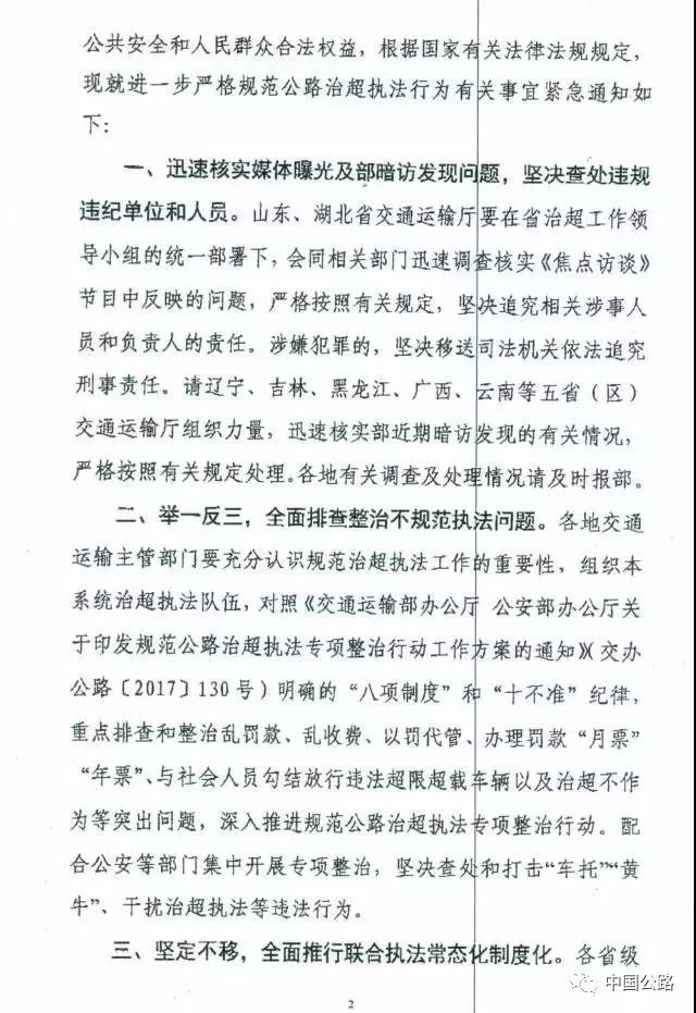 1月23日,中央電視臺(tái)《焦點(diǎn)訪談》欄目以“沉重的超載”為題,報(bào)道了山東和湖北兩省部分地區(qū)在公路治超執(zhí)法過(guò)程中,存在的“車托”“黃牛”“月票”等問(wèn)題。此前,我部結(jié)合規(guī)范公路治超執(zhí)法專項(xiàng)整治行動(dòng),組織力量,分三批次赴八個(gè)省份開(kāi)展了明察暗訪,也發(fā)現(xiàn)各地不同程度地存在著“黃?!?、治超不作為等現(xiàn)象,并通知各地調(diào)查核實(shí),嚴(yán)格按照規(guī)定處理。為貫徹落實(shí)黨的十九大精神,進(jìn)一步優(yōu)化營(yíng)商環(huán)境,切實(shí)維護(hù)社會(huì)公共安全和人民群眾合法權(quán)益,根據(jù)國(guó)家有關(guān)法律法規(guī)規(guī)定,現(xiàn)就進(jìn)一步嚴(yán)格規(guī)范公路治超執(zhí)法行為有關(guān)事宜緊急通知如下: